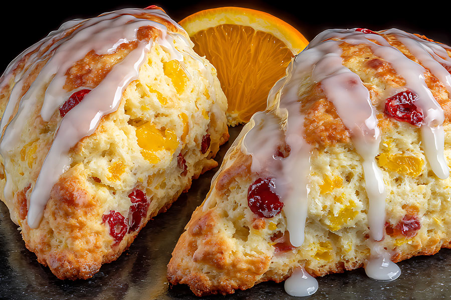 1- Orange Glazed Cranberry Scones 2 – Maple Bacon Biscuits with Hot Honey Butter 3 – Streusel Topped Pumpkin Muffins